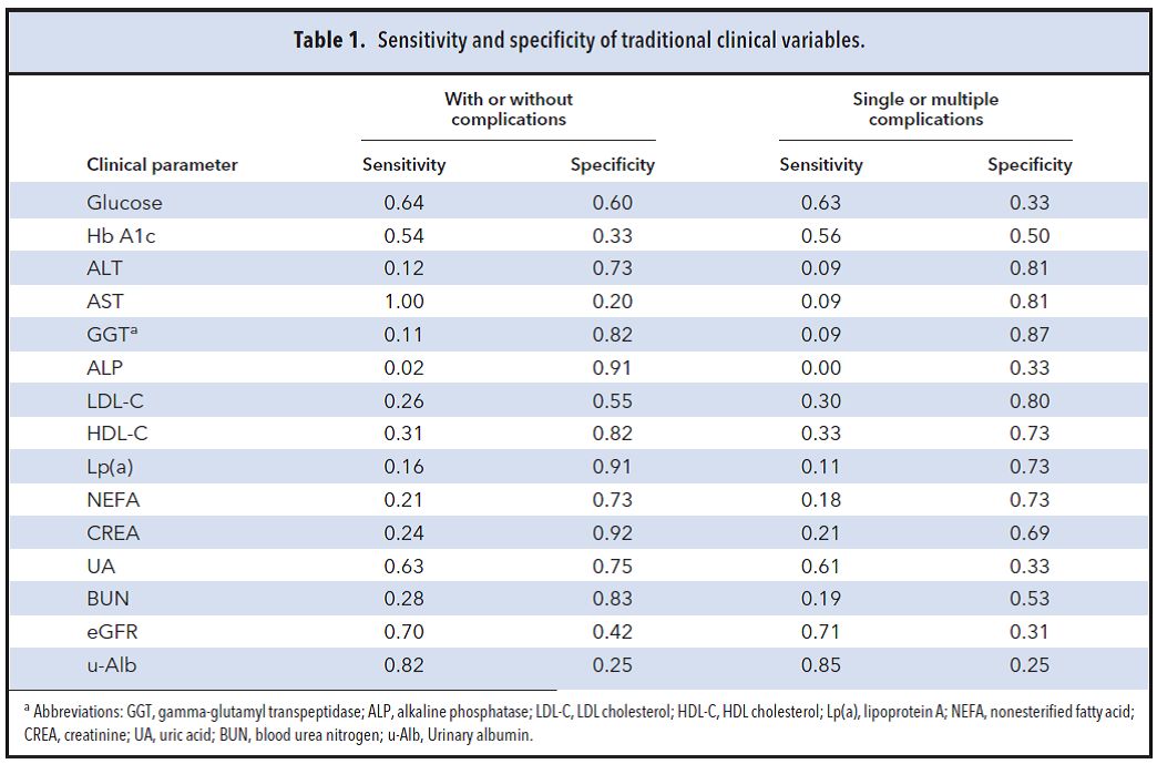 基于16基因组合模型 (Detection Model 1) 的加权平均分分析,发现无并发症病人的分数在训练集和测试集中都明显低于有并发症的病人。只考虑加权平均分的话,受试者工作特征曲线(ROC)分析表明将cutoff值设置成0.5时,在测试组中中的灵敏度为60%,特异性为100%。 5hmC标志物可区分病人是单一并发症还是多种并发症 50例有并发症的2型糖尿病病人被随机分成训练组(n=25)和测试组(n=25)。利用弹性网络筛选后发现,13基因-5hmC标志物组合可以区分2型糖尿病病人是否发生单一并发症或多种并发症。 基于13基因组合模型 (Detection Model 2), 我们计算了单一并发症和多种并发症的加权平均分,发现在训练集和测试集中单一并发症和多种并发症病人的分数都有明显差异。值得一提的是,有肾病并发症和无肾病并发症病人的分数也有明显差异。利用加权平均分作为判断标准的受试者工作特征曲线(ROC)表明,在测试组中当将cutoff值设成0.69时,灵敏度为87.5%,特异性为68.8%。 5hmC标志物与传统临床变量/危险因子的对比 我们评估了不同临床变量/危险因子用于监测血管并发症的灵敏度和特异性(见表1)。